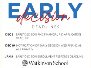 Parents of 6-9th grade applicants have one month to submit Early Decision apps. Increased interest in Watkinson has made the private school application process a year-round endeavor for our admissions team. Prospective families who identify Watkinson as their first choice have expressed that a shortened timeline would reduce stress for all involved. Key Dates for